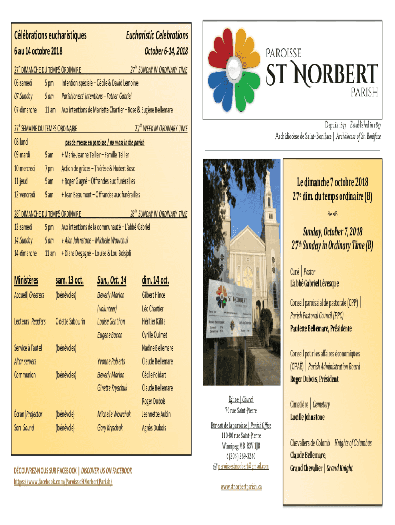 Celebrations eucharistiquesEucharistic Celebrations6 AU 14 October 2018October 614, 201827e COMANCHE DU TEMPS ORDINARY 27th SUNDAY IN ORDINARY TIME 06 named 5 pm Intention social Chile & David Heroine