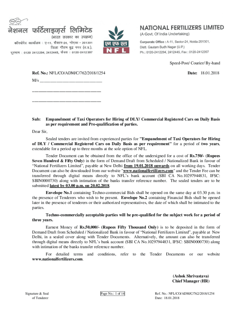 Speed Post/ Courier/ By hand Ref. No.: NFL/CO/ADM/C/762/2018/1254Date: 18.01.2018M/s ___ ___ ___Sub:Embankment of Taxi Operators for Hiring of DAY/ Commercial Registered Cars on Daily Basis as per