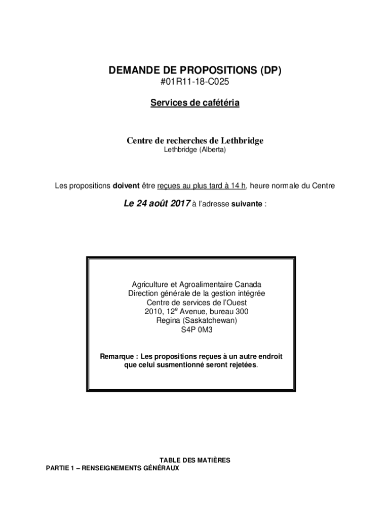 DEMAND DE PROPOSITIONS (DP) #01R1118C025 Services de caftriaCentre de recherché de Lethbridge (Alberta)Les propositions driven TRE Reyes AU plus tard 14 h, here normal Du Central 24 AOT 2017 lacrosse