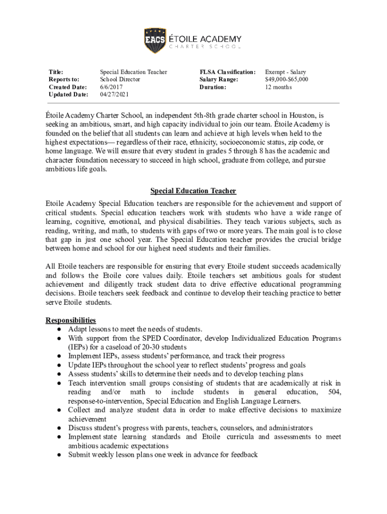 Title: Reports to: Created Date: Updated Date:Special Education Teacher School Director 6/6/2017 04/27/2021FLSA Classification: Salary Range: Duration:Exempt Salary $$49,00065,000 12 monthstoile Academy