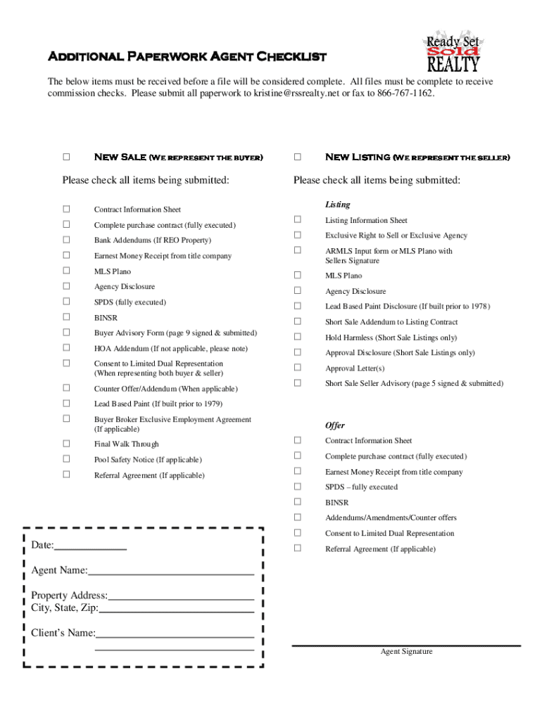 Additional Paperwork Agent Checklist The below items must be received before a file will be considered complete. All files must be complete to receive commission checks. Please submit all paperwork