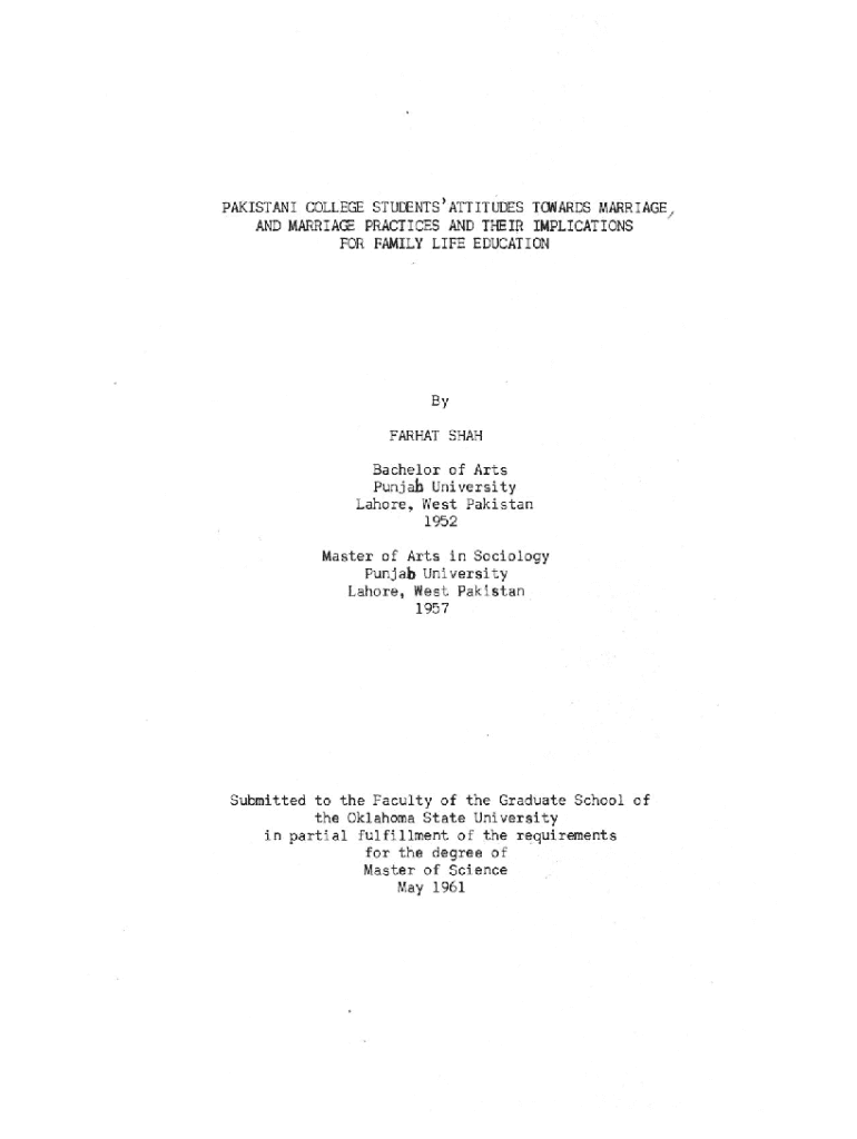 PAKISTANI COLLEGE STUDENTS 1 ATTITUDES TOWARDS MARRIAGE 1 AND MARRIAGE PRACTICES AND THEIR IMPLICATIONS FOR FAMILY LIFE EDUCATIONByFARHAT SHAH Bachelor of Arts Punjab University Lahore, West Pakistan