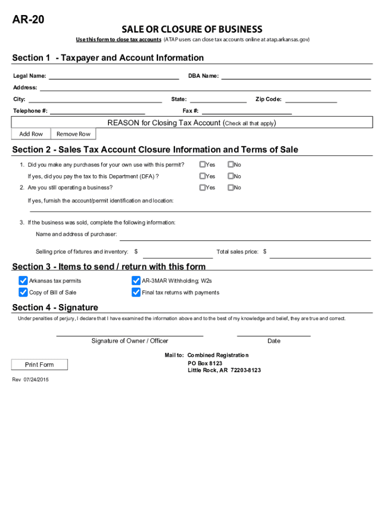 AR-20 Author: Bryan C. West Subject: Combined sale or closure of business form. Created Date: 1/6/2010 1:05:42 PM ...