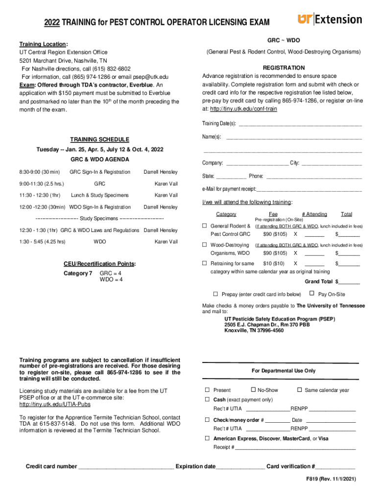 2022 TRAINING for PEST CONTROL OPERATOR LICENSING EXAM Training Location: UT Central Region Extension Office 5201 Merchant Drive, Nashville, TN For Nashville directions, call (615) 8326802 For information,