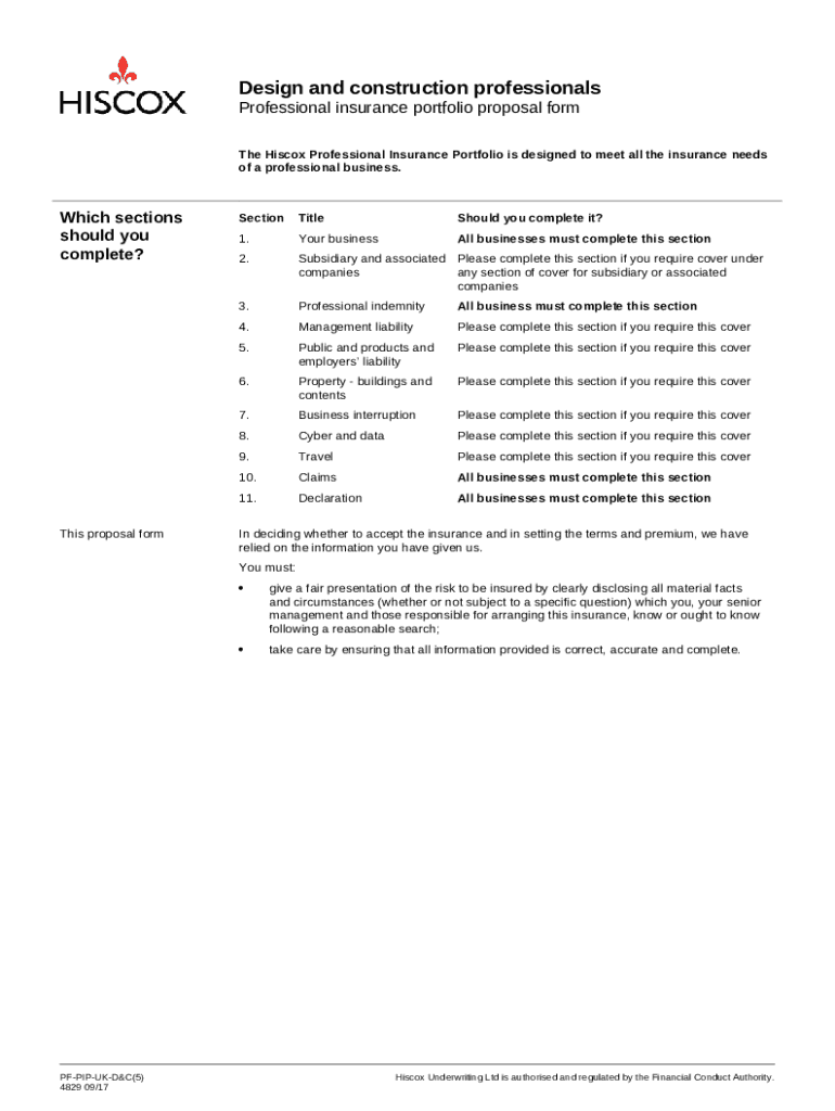 Instructions for the form Design and construction - proposal (UK). The Hiscox Professional Insurance Portfolio is designed to meet all the insurance needs of a professional business.