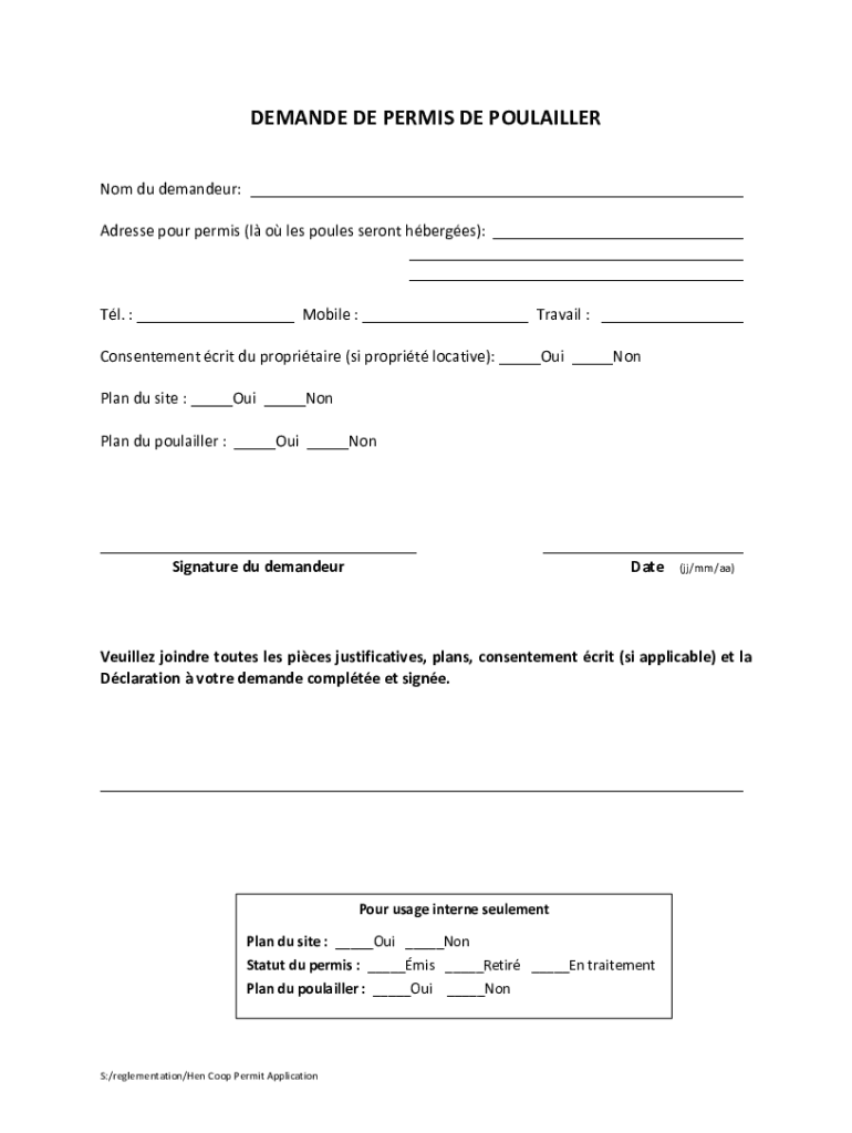 DEMAND DE PERMIT DE POULAILLER Not Du demander: ___ Address pour permit (l oles poles second heroes): ___ ___ ___ Tl. ___ Mobile : ___ Travail : ___ Contentment CRT Du proprietary (is profit vocative):