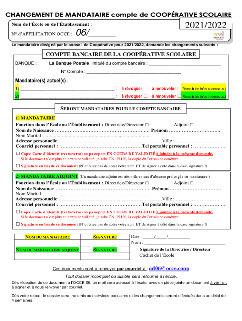 Not de Cole of de ltablissement : ___ N affiliation OCCE :06/___2021/2022Le mandate design par LE Conrail de Cooperative pour 2021/2022, demand LES arrangements servants :COMPETE LANCASHIRE DE LA