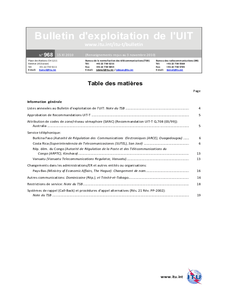 Bulletin d\'exploitation de l\'UIT www.itu.int/itut/bulletin No 96815 XI 2010Place DES Nations CH1211 Genre 20 (Swiss) Tl: +41 22 730 5111 Email: itumail@itu.int(Restatements Zeus AU 3 November 2010)