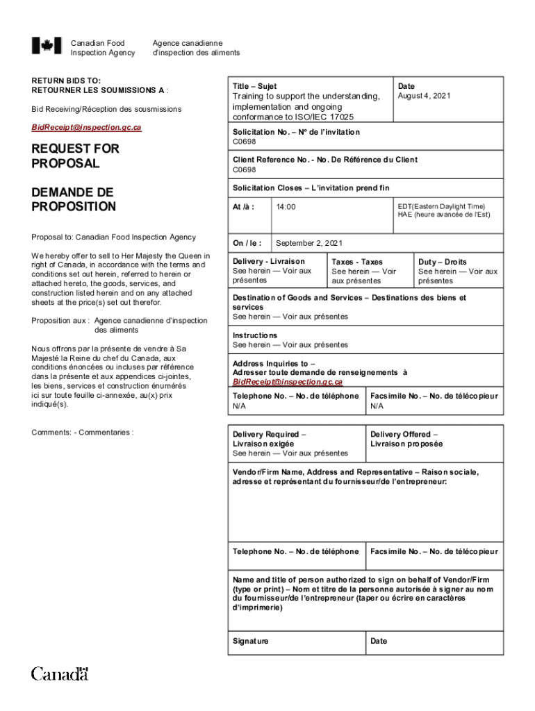 Canadian Food Inspection AgencyAgence Canadian inspection DES alimentsRETURN BIDS TO: RETURNER LES COMMISSIONS A : Bid Receiving/Reception DES sous missions BidReceipt@inspection.gc.caREQUEST FOR