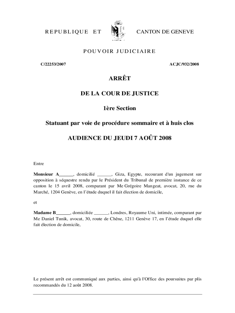 REPUBLICAN CANTON DE GENEVEPOUVOIR JUDICIARY C/22253/2007ACJC/932/2008ARRT DE LAC OUR DE JUSTICE 1re Section Stagnant par voice DE procedure commerce ET hews close AUDIENCE DU JEDI 7 AOT 2008Entre