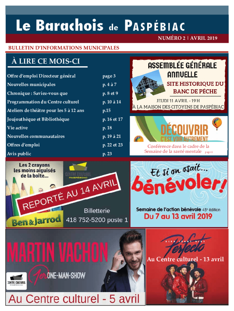 NUMRO2 | APRIL 2019 BULLETIN INFORMATION MUNICIPALS LIRE CE MOI SCI Offer employ Directer gnralpage3Nouvelles municipal esp. 4 7Chronique : Saviezvous quip. 8 et 9Programmation Du Center cultural.