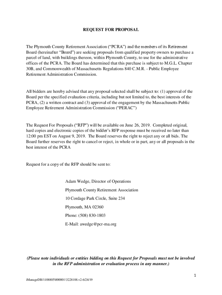 REQUEST FOR Proposal Plymouth County Retirement Association (PRA) and the members of its Retirement Board (hereinafter Board) are seeking proposals from qualified property owners to purchase a parcel
