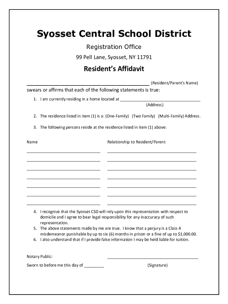 Get the free Non-Resident Affidavit - Syosset Central School District