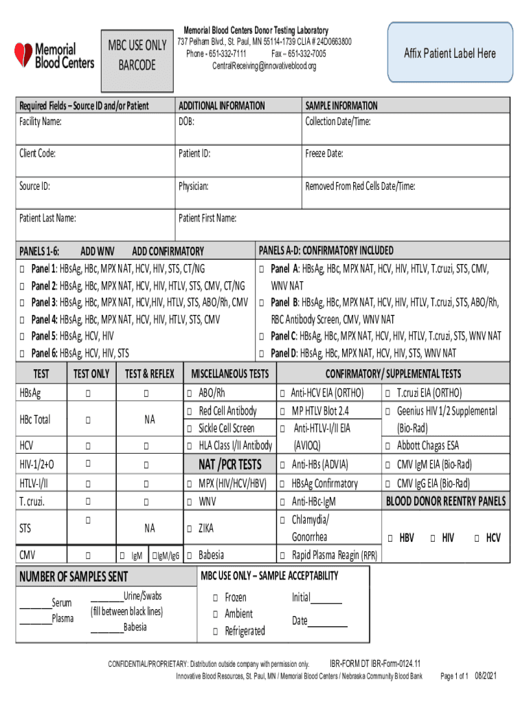 MBC USE ONLY BARCODEMemorial Blood Centers Donor Testing Laboratory 737 Pelham Blvd., St. Paul, MN 551141739 CIA # 24D0663800 Phone 6513327111 Fax 6513327005 CentralReceiving@innovativeblood.orgAffix