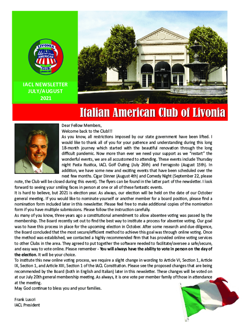 ICL IACLNEWSLETTER NEWSLETTER SEPTEMBER/OCTOBER SEPTEMBER/OCTOBER JULY/AUGUST 2020 2020 2021Italian Italian American Club of Livonia LivoniaDear Fellow Members, Dear Fellow Members, Dear Fellow Members,