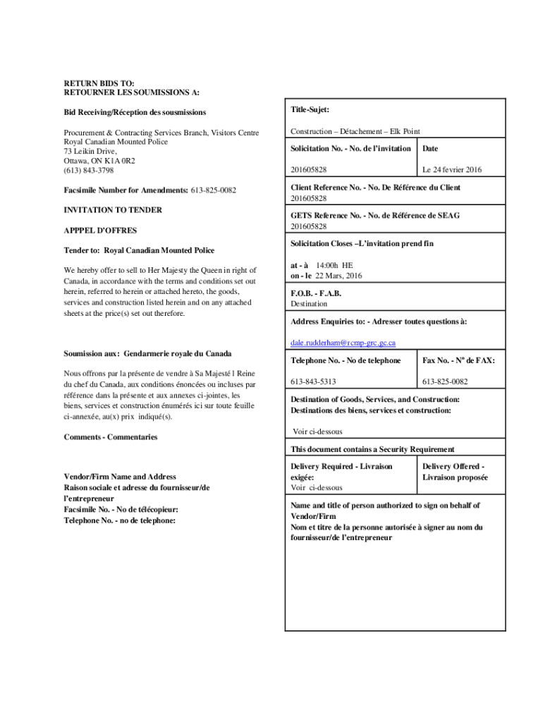 RETURN BIDS TO: RETURNER LES COMMISSIONS A: Bid Receiving/Reception DES sousmissionsTitleSujet:Procurement & Contracting Services Branch, Visitors Center Royal Canadian Mounted Police 73 Latin Drive,
