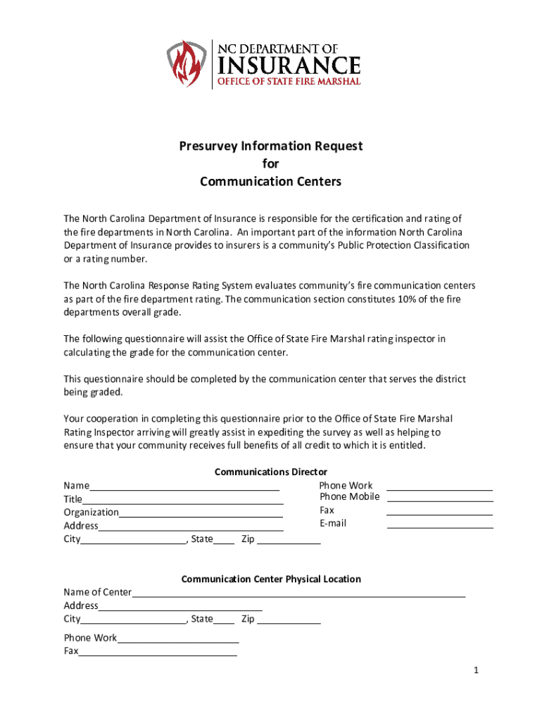 Resurvey Information Request for Communication Centers The North Carolina Department of Insurance is responsible for the certification and rating of the fire departments in North Carolina. An important