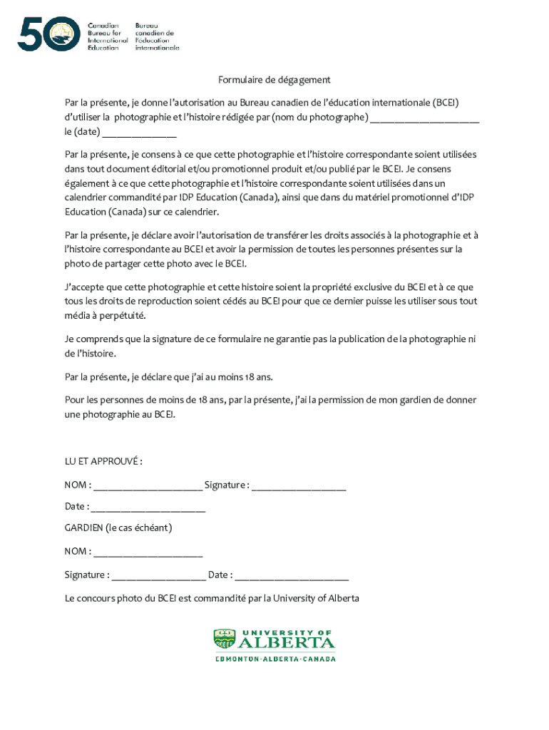 Formula ire DE engagement Par la present, JE Donne authorization AU Bureau Canadian de education Internationale (BCE) utilizer la photographic ET history ridge par (not Du photographs) ___ LE (date)
