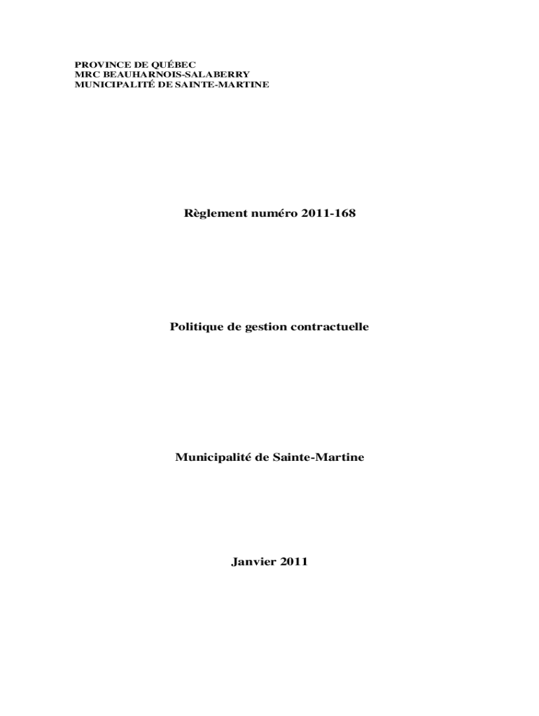 PROVINCE DE QUEBEC MRC BEAUHARNOISSALABERRY MUNICIPALITY DE SAINTEMARTINERglement humor 2011168Politique de section contractuelleMunicipalit de SainteMartineJanvier 2011Politique de section contractually