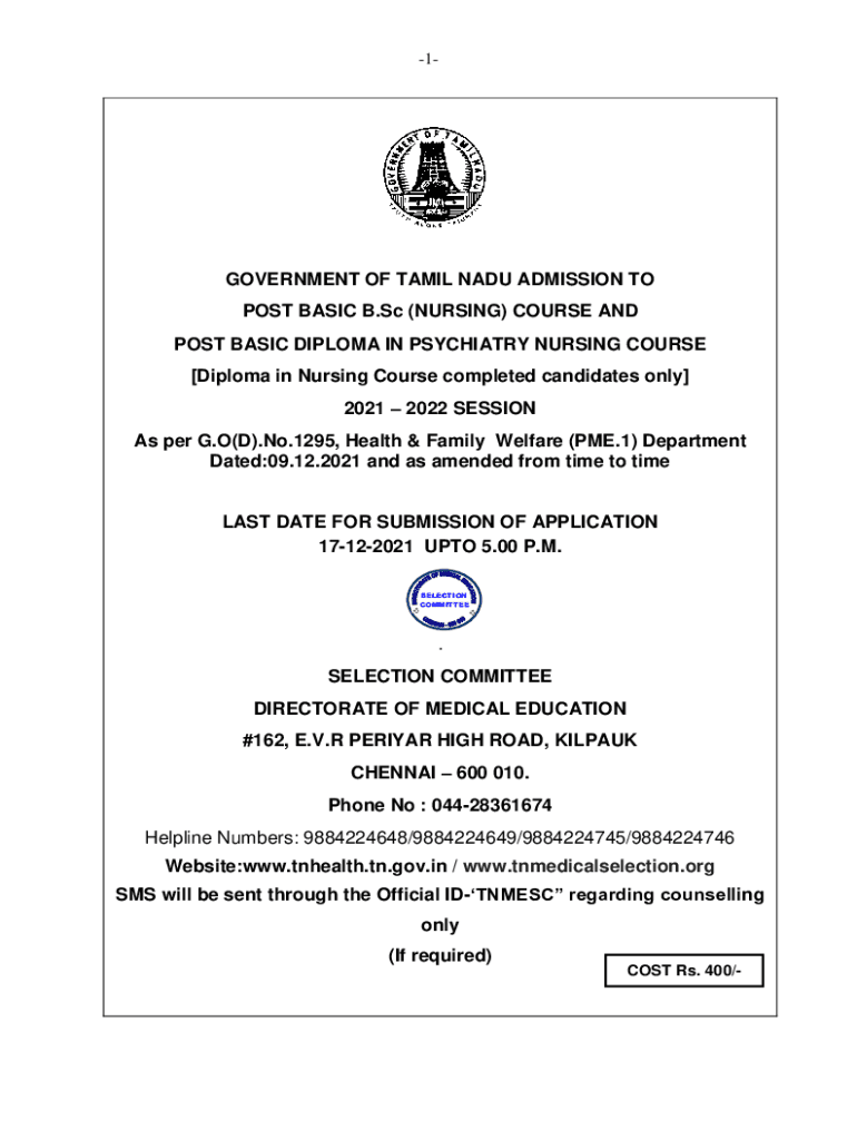 1GOVERNMENT OF TAMIL NADU ADMISSION TO POST BASIC B.Sc. (NURSING) COURSE AND POST BASIC DIPLOMA IN PSYCHIATRY NURSING COURSE [Diploma in Nursing Course completed candidates only] 2021 2022 SESSION