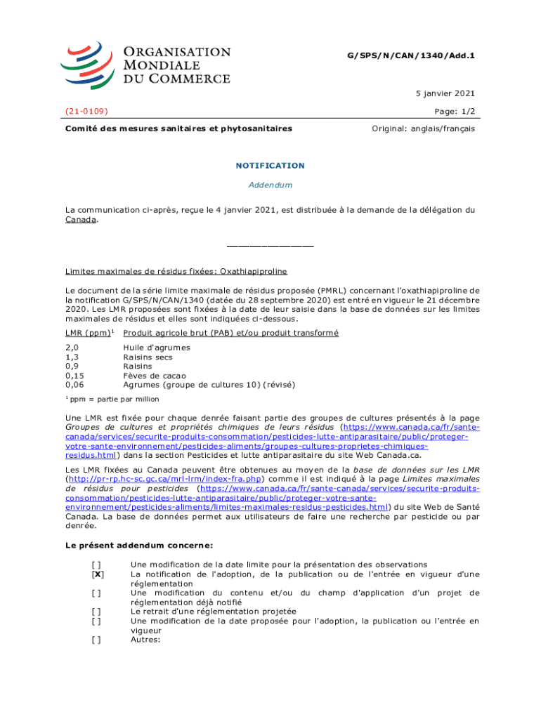 G/SPS/N/CAN/1340/Add.15 Janvier 2021 (210109)Page: 1/2Comit DES measures solitaires et phytosanitairesOriginal: angles/franaisNOTIFICATION Addendum La communication cars, reuse LE 4 Janvier 2021,