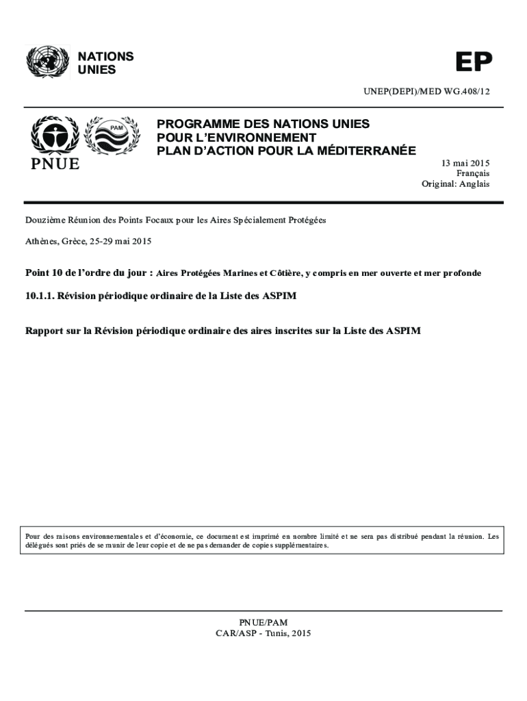 NATIONS UNITS NEP(DEVI)/ME DWG.408/12PROGRAMME DES NATIONS UNITS POUR ENVIRONMENT PLAN ACTION POUR LA MEDITERRANEAN 13 Mai 2015 Francis Original: AnglaisDouzime Union DES Points Focus pour LES Aires