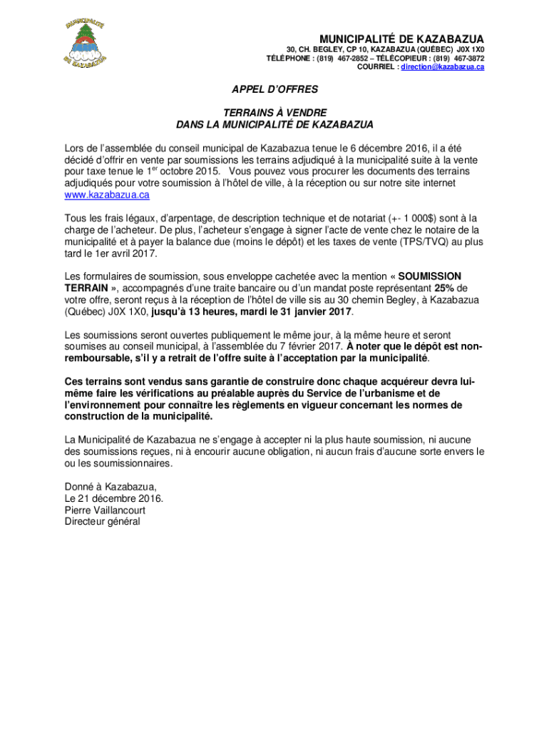 MUNICIPALITY DE KAZABAZUA30, CH. BAILEY, CP 10, KAWABATA (QUEBEC) J0X 1×0 PHONE : (819) 4672852 COPIER : (819) 4673872 COURIER : direction@kazabazua.caAPPEL DOFF RES TERRAINS VEND RE DAYS LA MUNICIPALITY