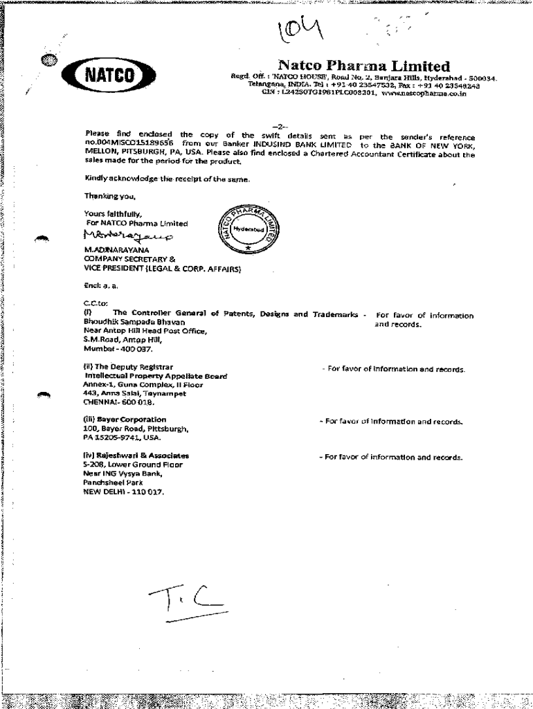. NATO Pharma Limited Red. Off. \'NATO HOUSE\', Road No. 2, Barbara Hills, Hyderabad 500034. Clang. Ana, INDIA. \'Jet: +9140 23547532, Fax: +9\'1 40 23548243 IN: L24230TG1981PLC003201, www.natcopharma.co.in2Please