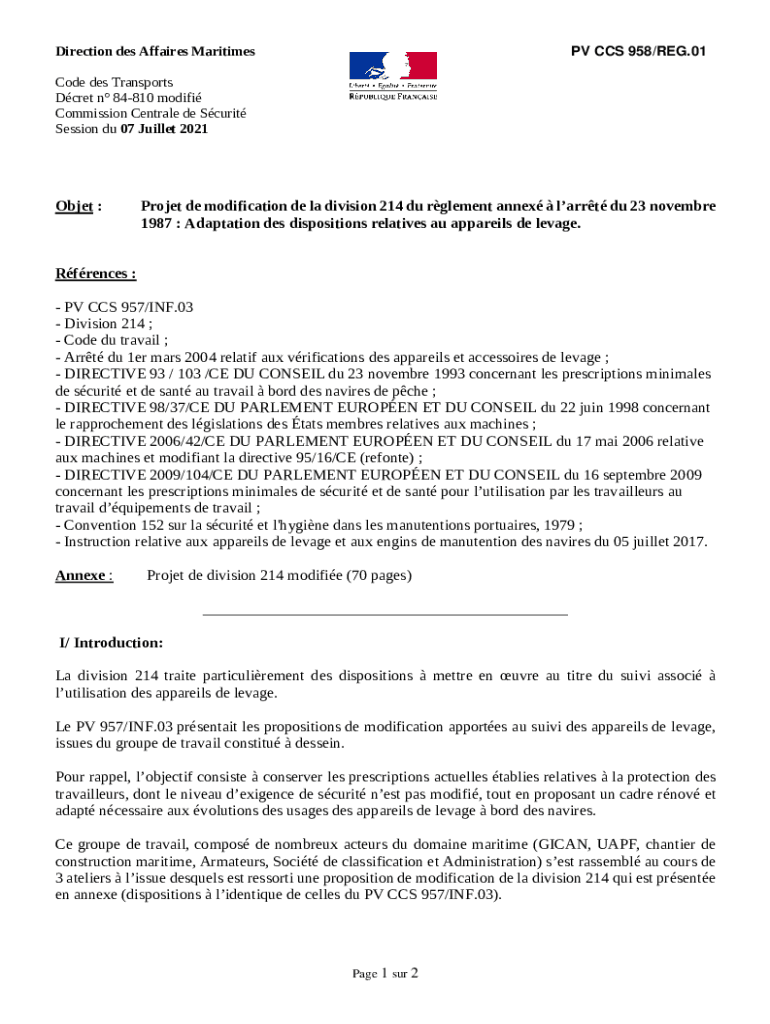 PV CCS 958/REG.01Direction DES Affairs Maritime Code DES Transports Crew n 84810 modify Commission Central de Scurit Session Du 07 Bullet 2021Objet :Project DE modification DE la division 214 Du element