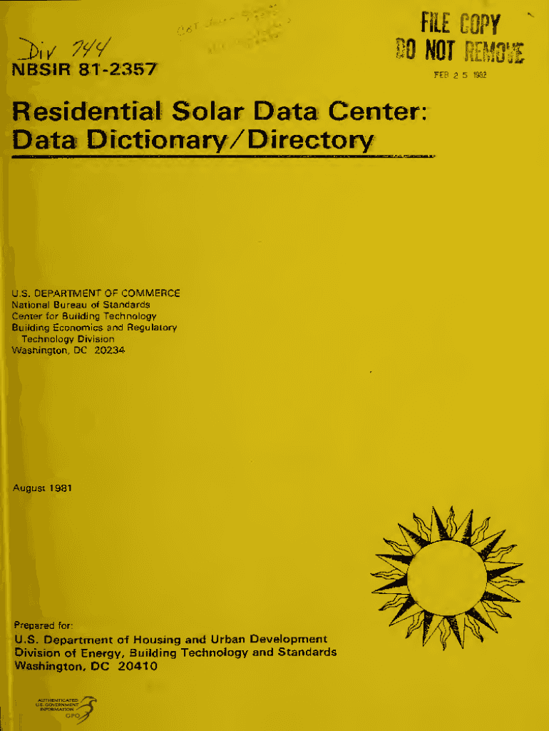 VFECflPiry/ IMPAIR 812357Residential Solar Data Center:Data Dictionary/Directory. S.DEPARTMENT OF COMMERCENational Bureau of StandardsCenter for Building Technology Building Economics and RegulatoryTechnology