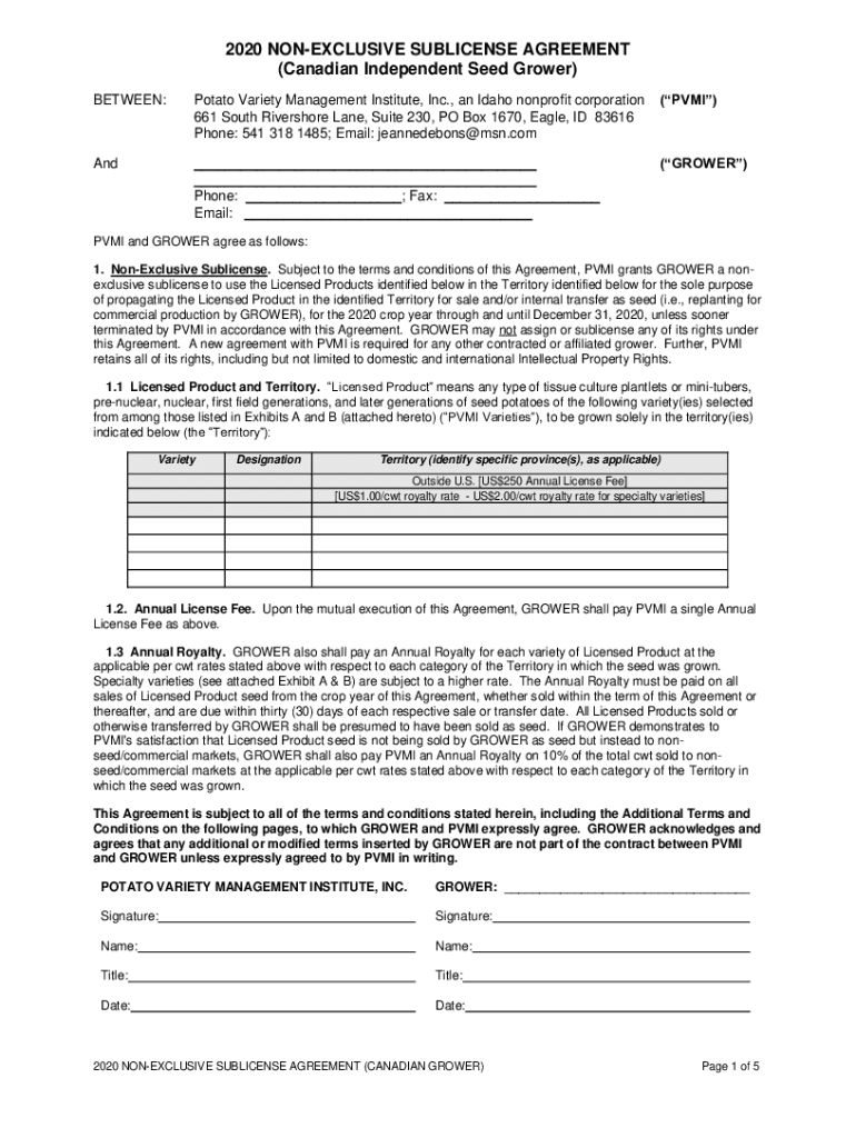 2020 NONEXCLUSIVE SUBLICENSE AGREEMENT (Canadian Independent Seed Grower) BETWEEN:Potato Variety Management Institute, Inc., an Idaho nonprofit corporation 661 South River shore Lane, Suite 230, PO