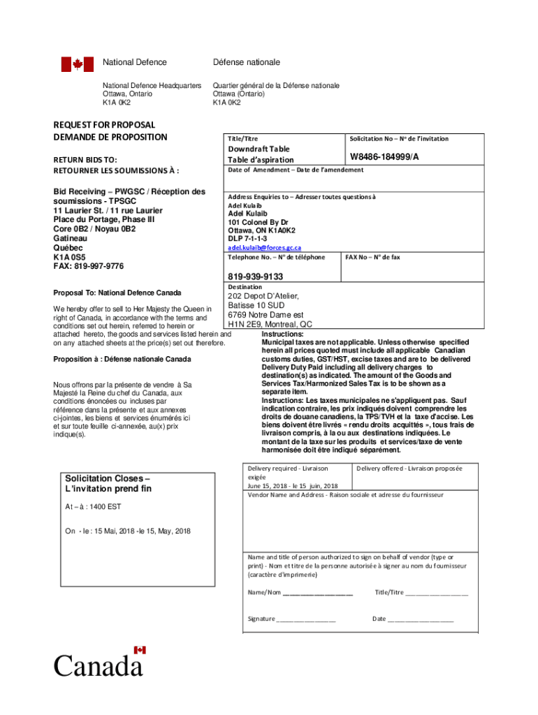 National DefenceDfense nationaleNational Defense Headquarters Ottawa, Ontario K1A 0K2Quartier gnarl DE la Defense national Ottawa (Ontario) K1A 0K2REQUEST FOR PROPOSAL DEMAND DE PROPOSITION RETURN