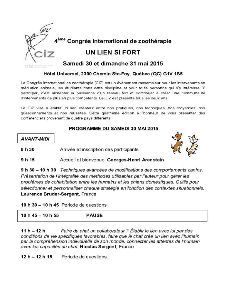 4me Congas international de zoothrapieUN LIEN SI FORT Named 30 et Comanche 31 Mai 2015 Hotel Universal, 2300 Che min Steady, Quebec (QC) G1V 1S5 Le Congas international de zoothrapie (CIA) est UN