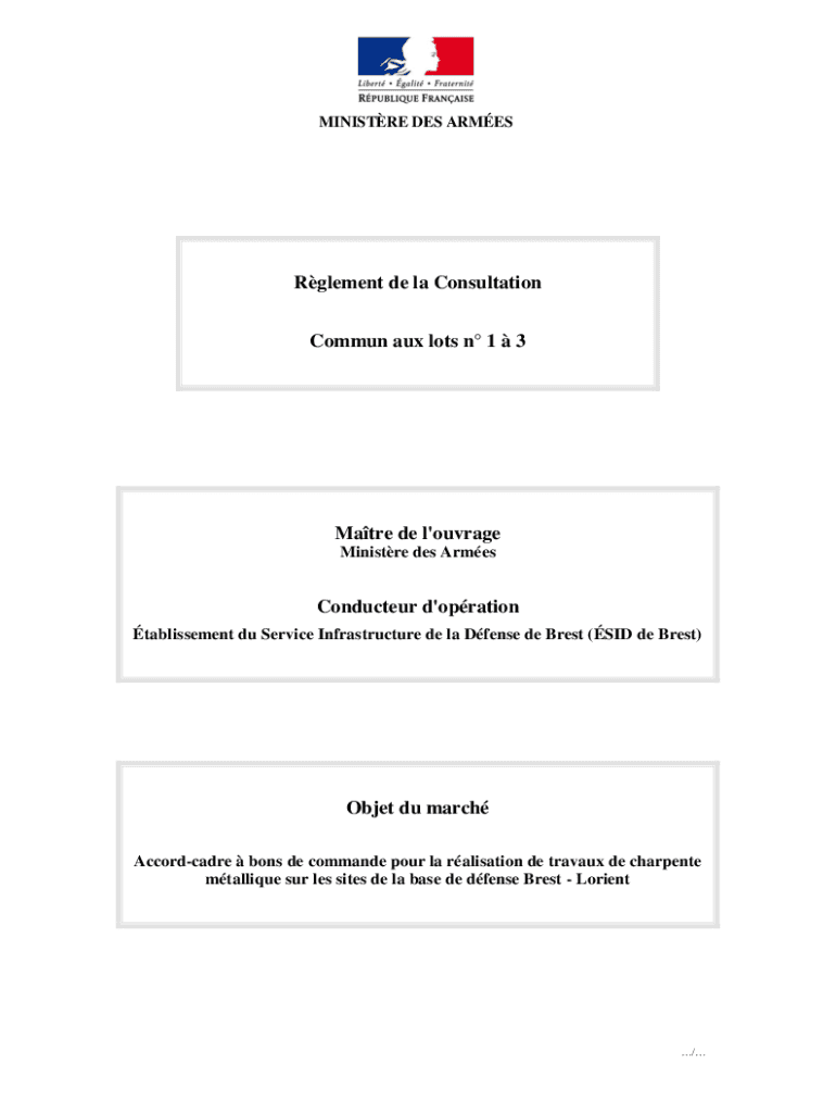 MINISTRY DES ARMESRglement de la Consultation Common aux lots n 1 3Matre de l\'outrage Minister DES ArmesConducteur d\'operation tablissement Du Service Infrastructure de la Defense de Brest (SID