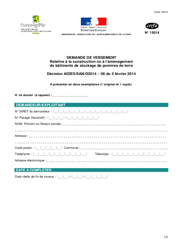CERFA 15014MINISTERE DE L\'AGRICULTURE, DE LAGROALIMENTAIRE ET DE LA FORETN 15014DEMANDE DE VEHEMENT Relative la construction of management DE aliments DE stockade DE pommel de Terry Decision AIDES/SAN/D2014
