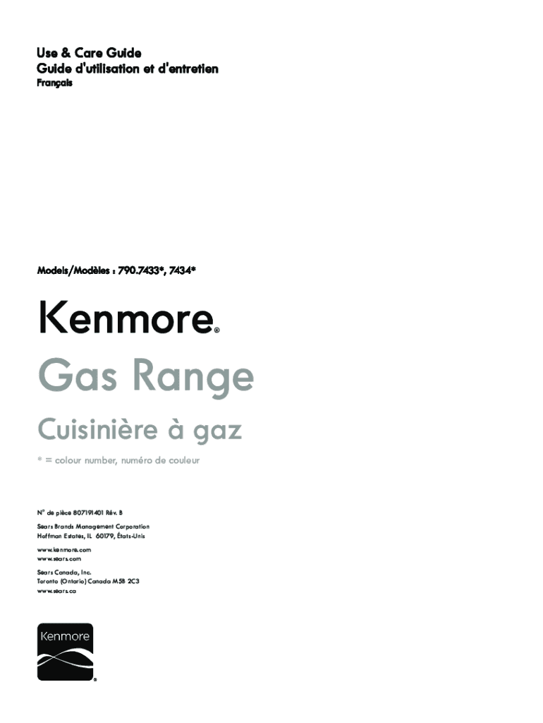 Use & Care Guide d\'utilization et d\'entertain FranaisModels/Models: 790.7433×, 7434×Kenmore Gas Range Cuisine gas * color number, humor de Goulburn de nice 807191401 RV. B Sears Brands Management