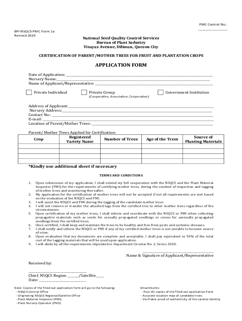 BPINSQCSPMC Form 1a Revised 2020PMC Control No.: ___National Seed Quality Control Services Bureau of Plant Industry Visayans Avenue, Dalian, Quezon CityCERTIFICATION OF PARENT/MOTHER TREES FOR FRUIT