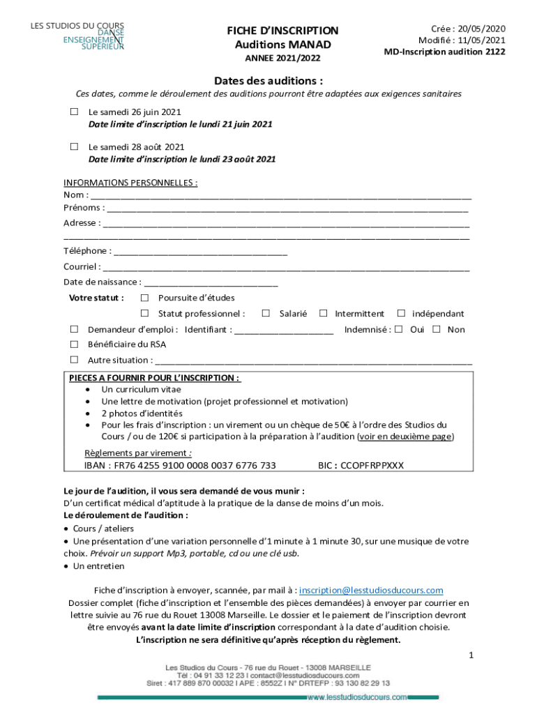 FICHE INSCRIPTION Auditions MONAD ANNE 2021/2022Cre : 20/05/2020 Modify : 11/05/2021 Inscription audition 2122Dates DES auditions : Ce's dates, come LE procurement DES auditions current TRE adapted