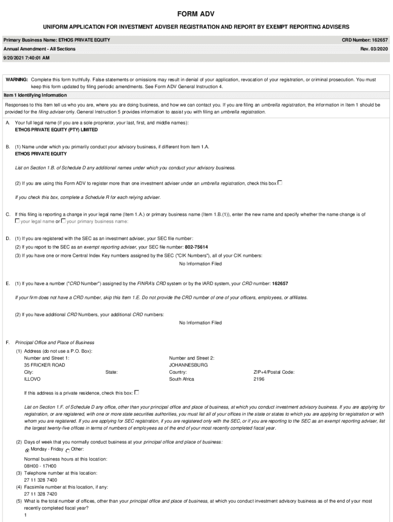 FORM ADV UNIFORM APPLICATION FOR INVESTMENT ADVISER REGISTRATION AND REPORT BY EXEMPT REPORTING ADVISERS Primary Business Name: ETHOS PRIVATE EQUITY CRD Number: 162657Annual Amendment All Sections