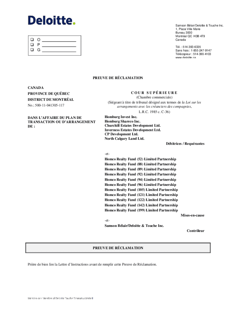 Samson Blair/Deloitte & Touché Inc. 1, Place Ville-Marie Bureau 3000 Montreal QC H3B 4T9 Canada O P GPL. 5143936335 Sans fries : 18552479147 Copiers : 5143904103 www.deloitte.caPREUVE DE RECLAMATION