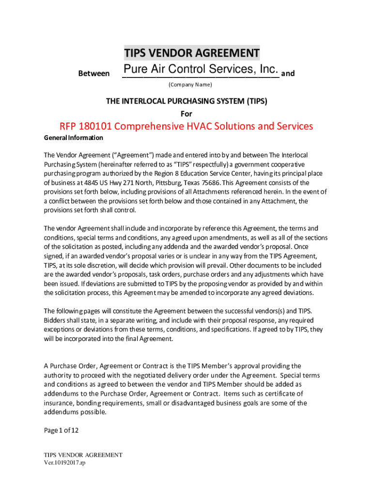 TIPS VENDOR AGREEMENT BetweenPure Air Control Services, Inc. and ___ (Company Name)THE INTERLOCK PURCHASING SYSTEM (TIPS) For RFP 180101 Comprehensive HVAC Solutions and Services General Information