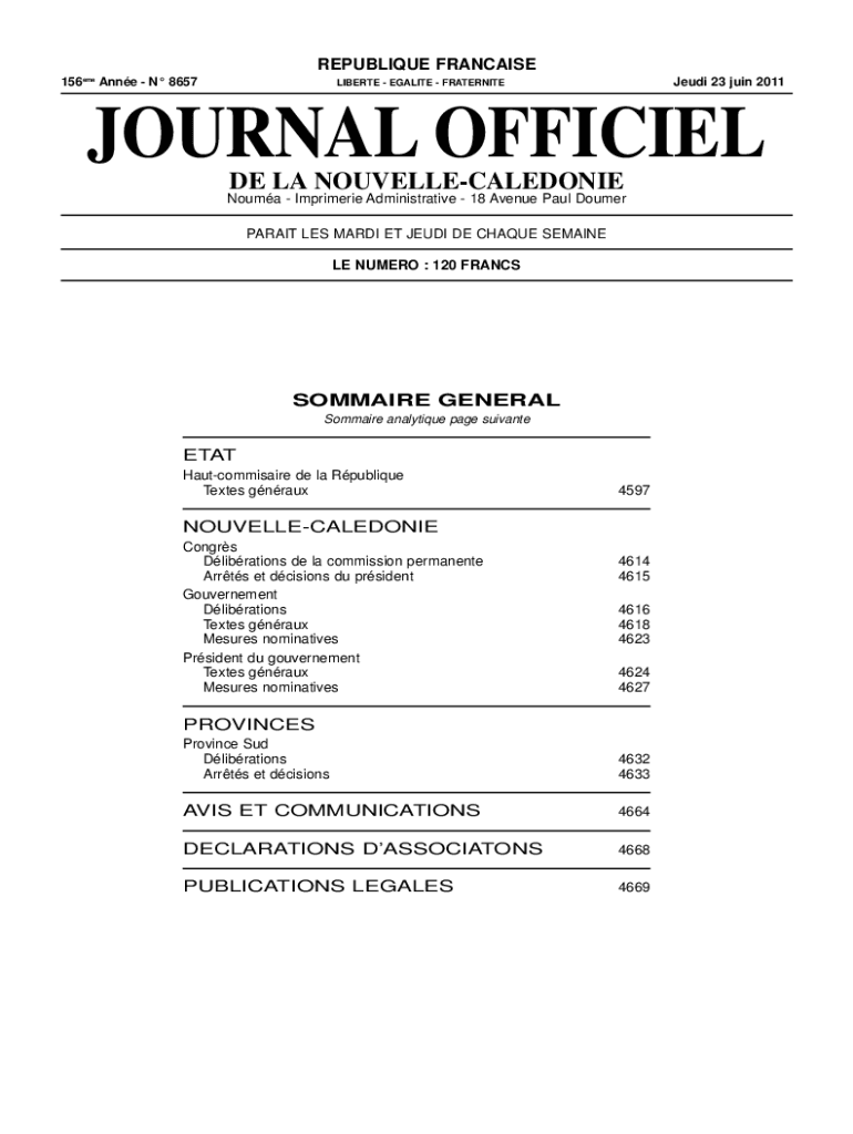 REPUBLICAN FRANCAISE156eme Anne N 8657Jeudi 23 join 2011LIBERTE ELITE FRATERNITEJOURNAL OFFICIAL DE LA NOUVELLECALEDONIENouma Imprimis Administrative 18 Avenue Paul Dormer PARFAIT LES MARI ET JEDI