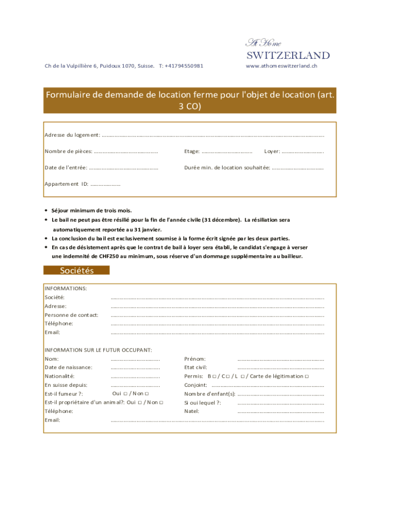 At Home SWITZERLAND ChdelaVulpillire6,Puidoux1070,Swiss. T:+41794550981www.athomeswitzerland.chFormulairededemandedelocationfermepourl\'objetdelocation(art. 3CO) Adressedulogement: