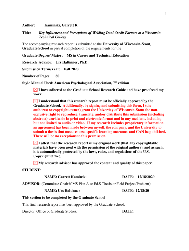 1 Author: Title:Kaminski, Garrett R. Key Influences and Perceptions of Welding Dual Credit Earners at a Wisconsin Technical College accompanying research report is submitted to the University of Wisconsin