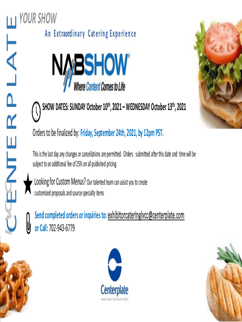 LCVCECNTERPLATEYOUR SHOW A n E × t record i n an r y C at e r i n g E × p e r i e n c show DATES: SUNDAY, October 10th, 2021 WEDNESDAY, October 13th, 2021 Orders to be finalized by: Friday, September