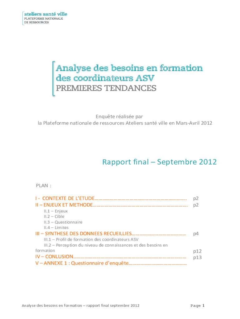 Analyze DES begins en formation DES coordinates ASV PREMIERES TENDANCESEnquteralisepar laPlateformenationalederessourcesAtelierssantvilleenMarsAvril2012RapportfinalSeptembre2012PLAN: ICONTEXTEDELETUDE