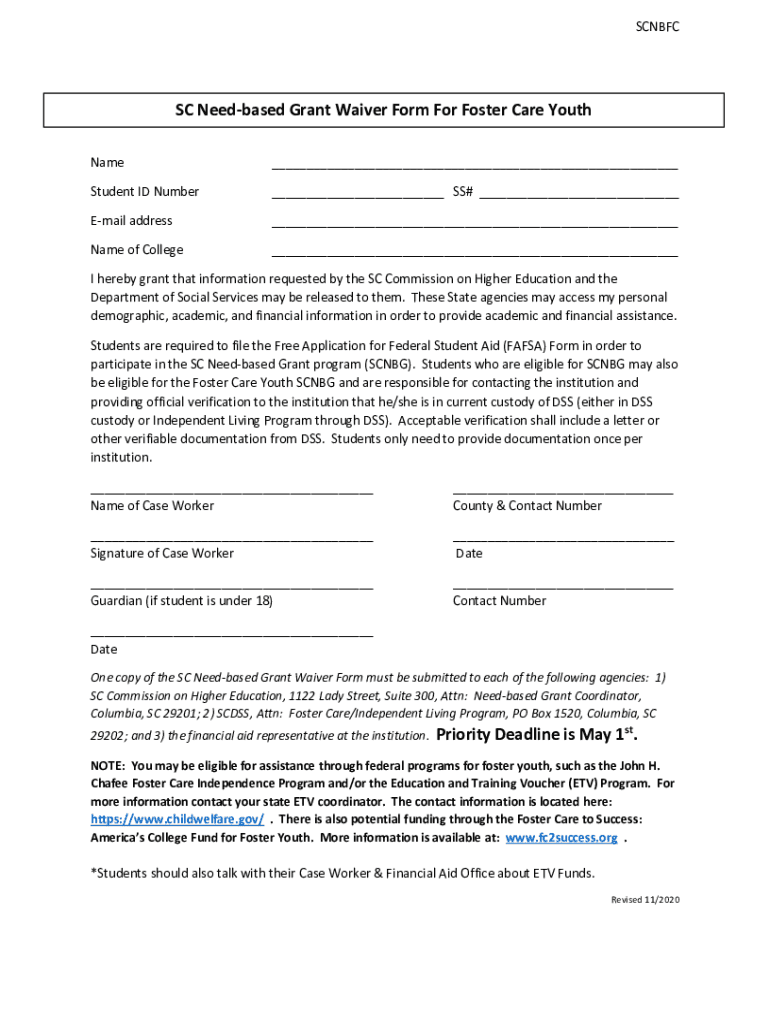 SCNBFCSC Need based Grant Waiver Form For Foster Care Youth Name___Student ID Number___ SS# ___Email address___Name of College___I hereby grant that information requested by the SC Commission on Higher