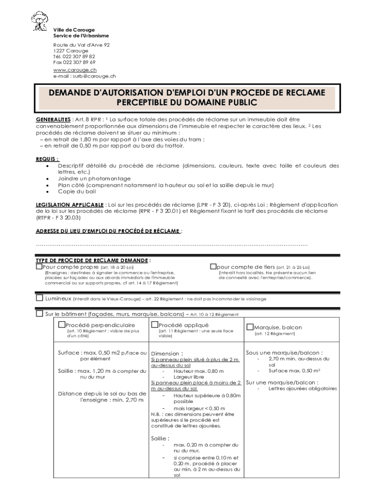 Villa de Carouge Service de l\'Urbanism Route du Val d\'Are 92 1227 Carouse Tl. 022 307 89 82 Fax 022 307 89 69 www.carouge.ch email : surb@carouge.chDEMANDE D\'AUTHORIZATION D\'EMPLOY D\'UN PRECEDE