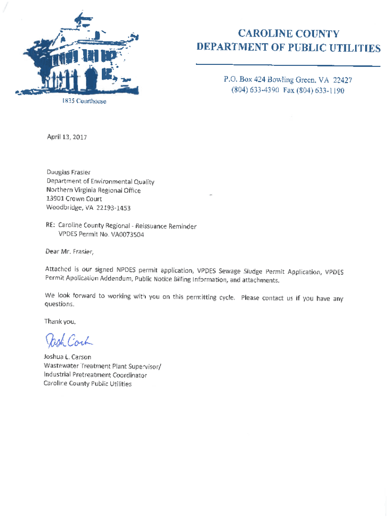 CAROLINE COUNTY DEPARTMENT OF PUBLIC UTILITIES P. O. Box 424 Bowling Green, VA 22427^(804) 6334390 Fax (804) 6331190 I S35 CourthuuseApril 13, 2017Douglas FrasierDepartment of Environmental Quality