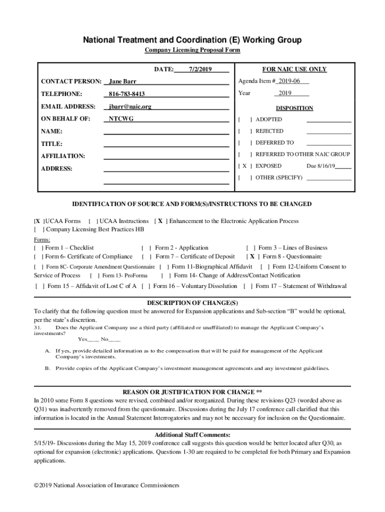 National Treatment and Coordination (E) Working Group Company Licensing Proposal Form DATE:7/2/2019FOR NAIL USE NON-CONTACT PERSON:Jane Barraged Item # 201906TELEPHONE:8167838413YearEMAIL ADDRESS:jbarr@naic.organ